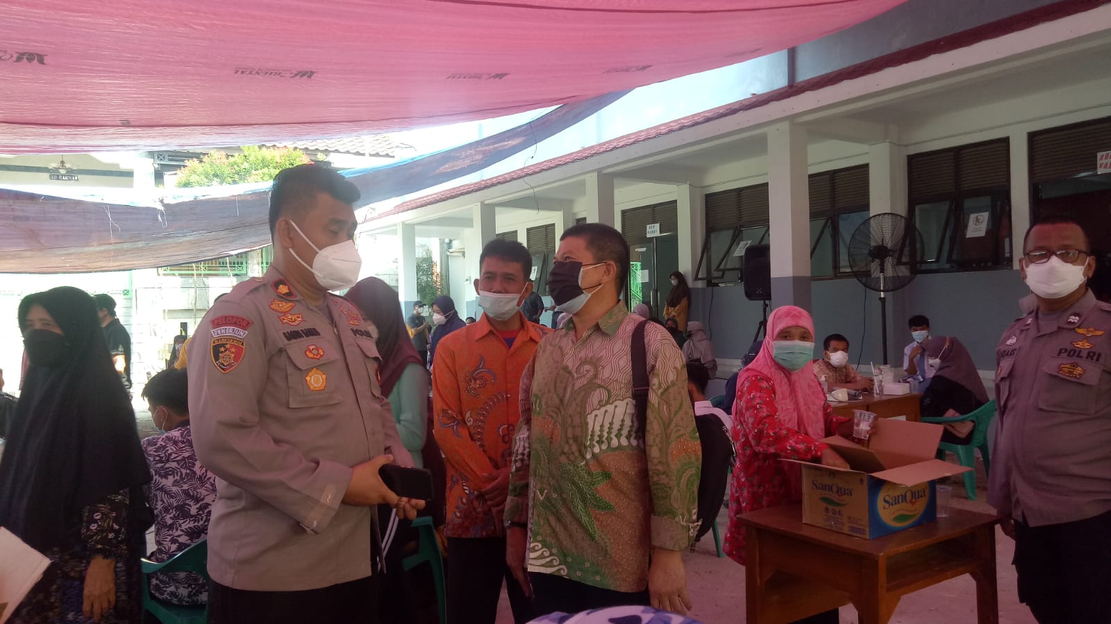Kapolsek Karawaci Kompol Bagin Efrata Barus meninjau vaksinasi di gedung SMA Al Furqon, Cimone Jaya, Karawaci.(iws)
