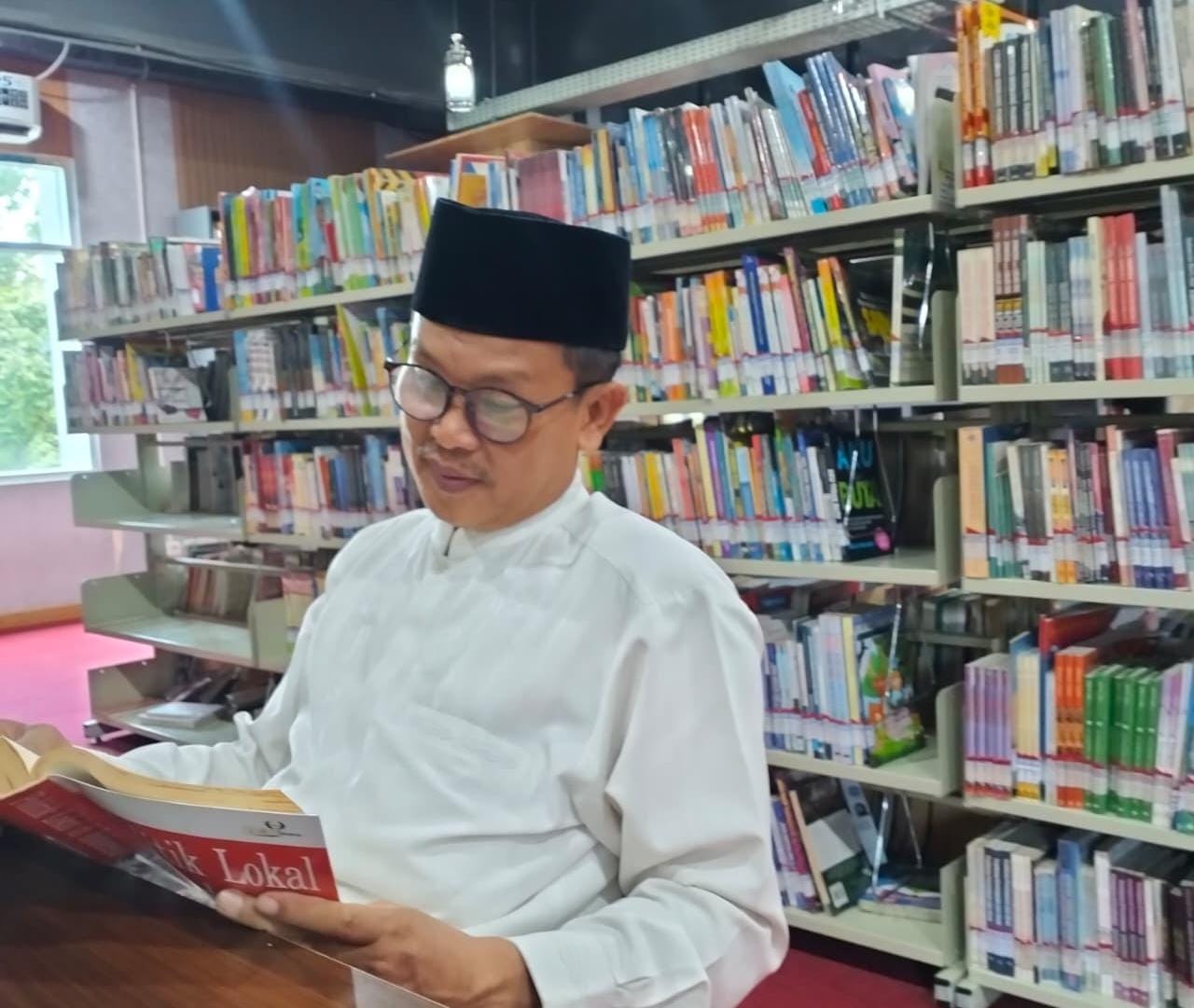 Kepala SDN Cipondoh 1, Jamhuri, memanfaatkan waktu membaca di perpustakaan daerah Kota Tangerang.(setia)