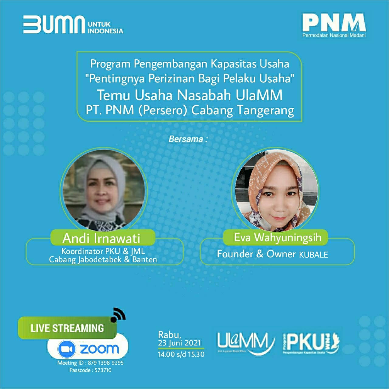 Sebagai pembicara dalam meeting zoom itu Andi Irnawati, selaku Koordinator PKU dan JML Cabang Jabodetabek dan Banten, kemudian Founder dan Owner Kubale Eva Wahyuningsih, sebagai moderator Muslim Mubaroq dari Program (PKU) Pengembangan Kapasitas Usaha PT PNM Cabang Tangerang.