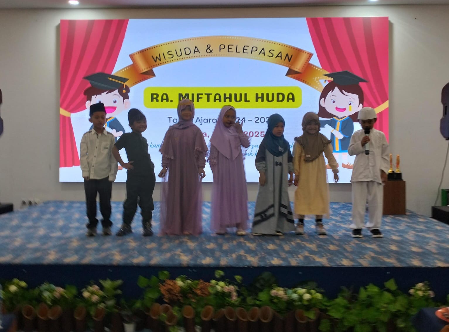 Para siswa – siswi RA Miftahul Huda itu tampil berani dan percaya diri menunjukan kemampuannya di depan ratusan orang tua siswa, para pengajar dan tamu undangan.
